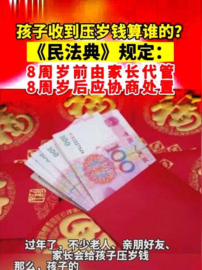 ……而说到压岁钱的归属,民法典中还真有相关的规定,依据我们的民法典规定呢,压岁钱属于赠与,那么就属于孩子的,但是作为父母呢,可以有管理权,比如说,八岁以下的孩子属于无行为能力的人,那么父母可以代为管理,但是到了八岁以上,属于限制行为能力的孩子,家长可以跟他们协商这笔钱怎么用。