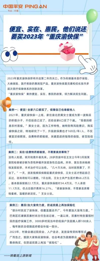 “重庆渝快保”是由重庆市医疗保障局和重庆银保监局指导监督,围绕多层次医疗保障体系建设,契合重庆“大城市大农村”二元结构城乡居民医疗保障需求,紧密衔接重庆市基本医疗保险的一款普惠型补充商业医疗保险。其普惠性体现在“低保费、低门槛、低免赔”、“医保个账支付”和“一站式结算”等政策支持,其公平性和可持续性体现在,69元和169元两档价格,通过科学界定既往病群体和健康群体,设置不同的赔付比例和有限的保障责任范围,统筹城乡,使更多患重病参保人在基本医保外的高额医疗费用负担,在一定程度上得到降低,继而起到防范因病致贫返贫、促进共同富裕的作用。“重庆渝快保”全年赔付率被要求不低于80%,具备较强的政策性和惠民性。